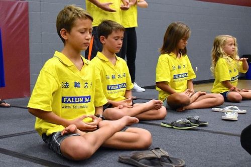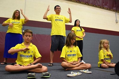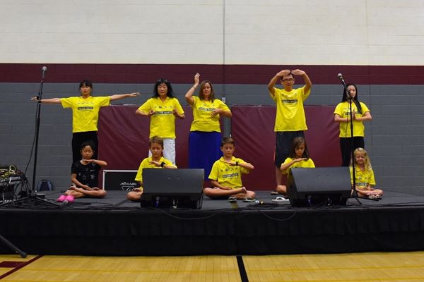 学员们还在学校布置的舞台上展示五套优美祥和的功法,引起不少观众定睛观看。悠扬的炼功音乐随着活动现场的音响,将法轮功的宁静祥和传达至每一个路过的人。