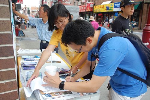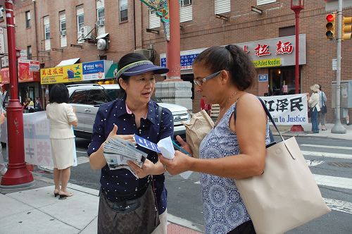 【明慧网二零一七年八月十八日】美国大费城地区部份法轮功学员于二零一七年八月十二日,在费城中国城,向过往民众介绍促进身心健康的法轮功,并呼吁制止还在中国发生的对法轮功的残酷迫害
