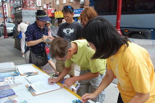 '图7~14:行人们驻足和学员交谈,并签名支持法轮功学员。'