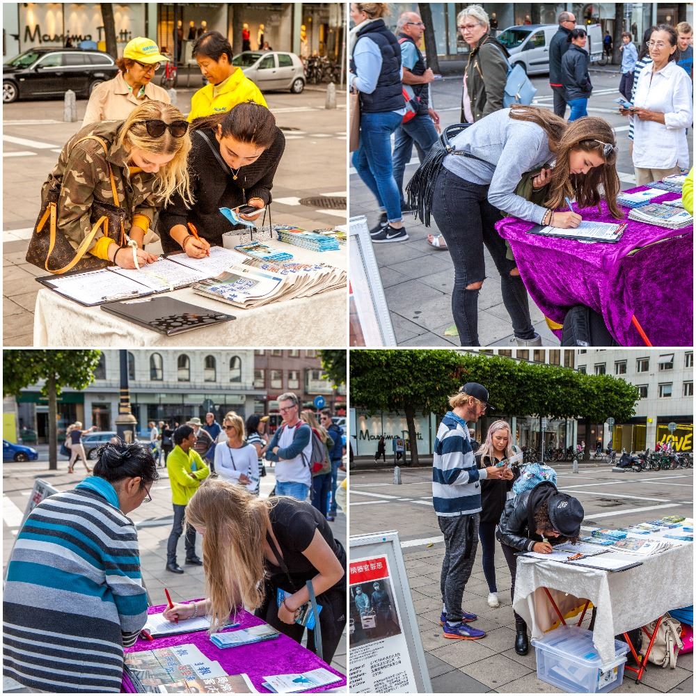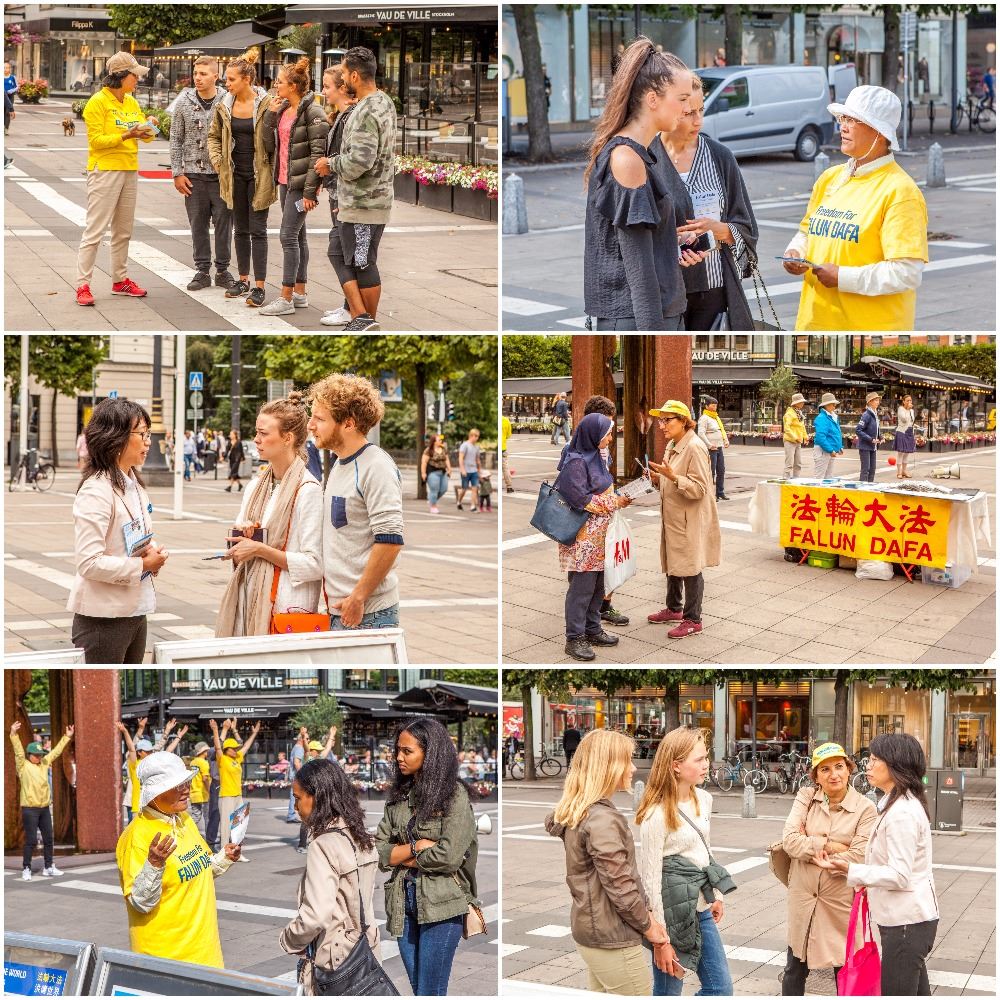 【明慧网二零一七年八月二十一日】二零一七年八月十八日至十九日,瑞典部份法轮功学员在斯德哥尔摩的北城广场(Normalmstorget)摆上信息台、真相展板、展示法轮功的五套功法,把法轮大法的美好带给善良的瑞典民众,同时向人们揭露中共十八年来对法轮功学员的残酷迫害,尤其是活摘法轮功学员器官的罪行并征集反迫害签名。