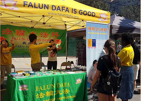 8月20日,纽约曼哈顿上东城举办了EMCC社区福利节活动。法轮功学员们义务向各国游客和居民介绍法轮功提高身心健康的显著效果。