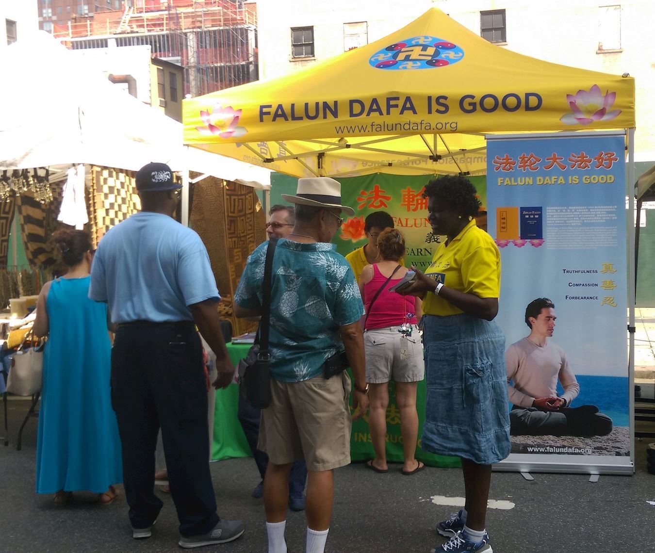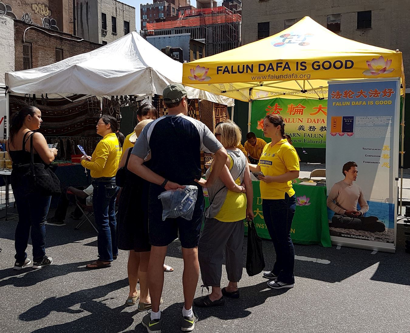【明慧网二零一七年八月二十三日】二零一七年八月二十日,纽约曼哈顿上东城(Upper East Side)举办了EMCC社区福利节(EMCC Community Benefit Festival),热闹的活动沿着二大道延绵二十条街。当天天气晴朗,这里迎来了人山人海的游客和当地居民的光临。法轮功学员们利用周末的休息时间也来到这个社区,义务向各国游客和居民介绍法轮功提高身心健康的显著效果。