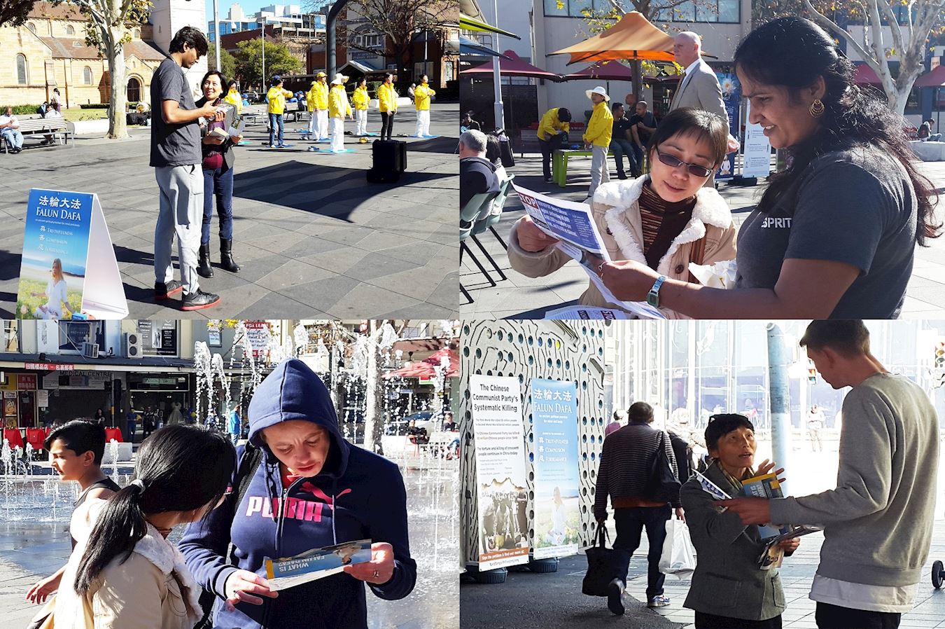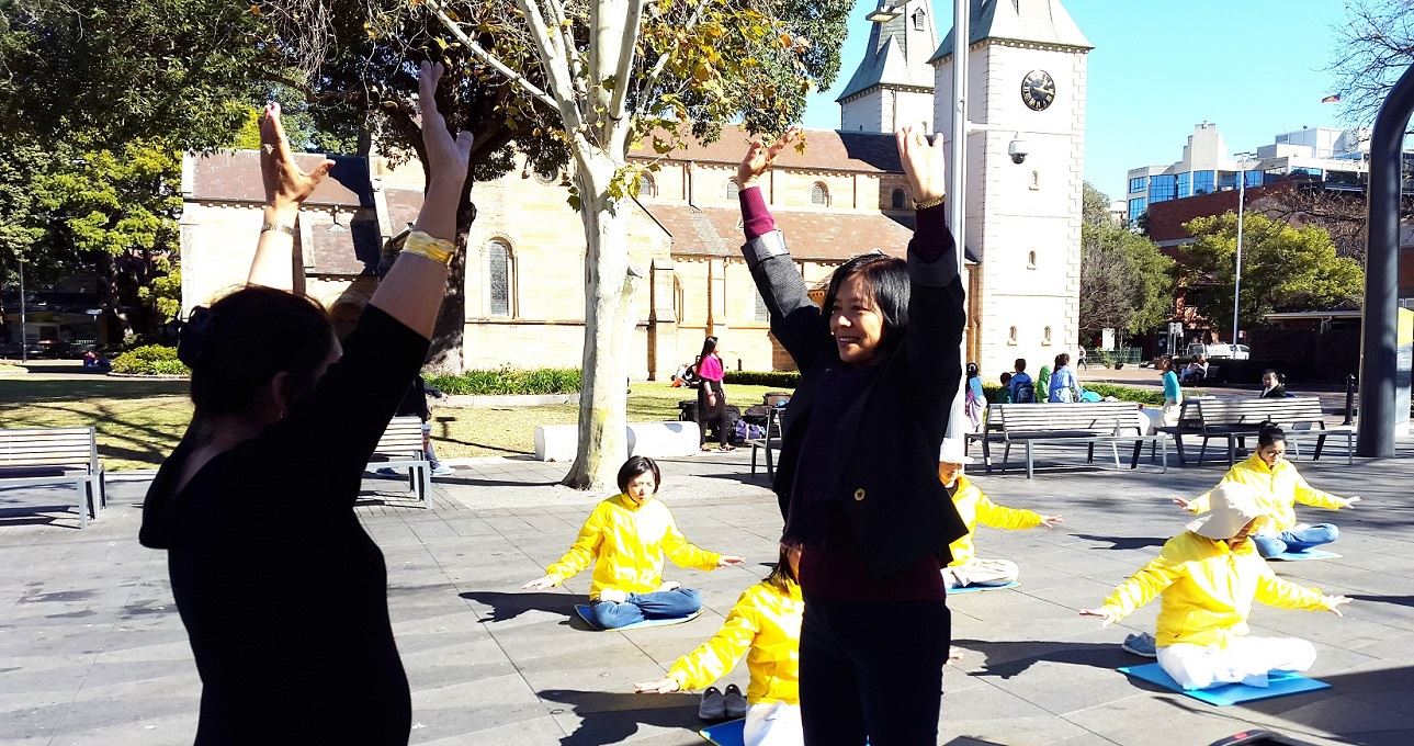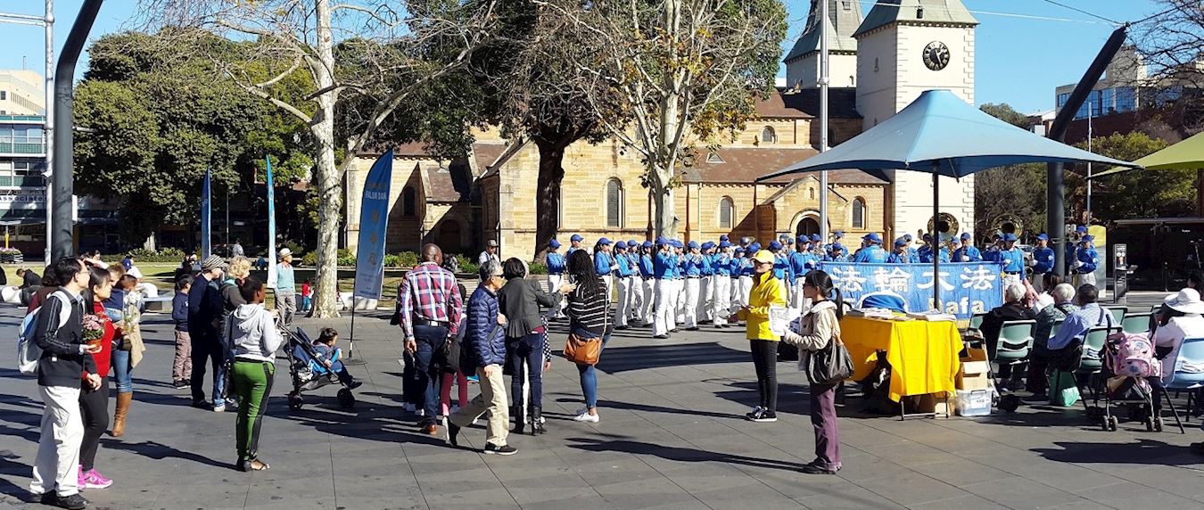 【明慧网二零一七年八月三日】(明慧记者华清悉尼采访报道)二零一七年七月二十九日,周六的悉尼帕拉玛塔(Parramatta City)市政厅广场上的人们被法轮功天国乐团嘹亮的合奏音乐吸引而驻足;当他们看到身着亮丽炼功服的法轮功学员示范、教功并听到他们分享修炼后身心受益体会时,更是表示喜爱和有兴趣参与修炼。