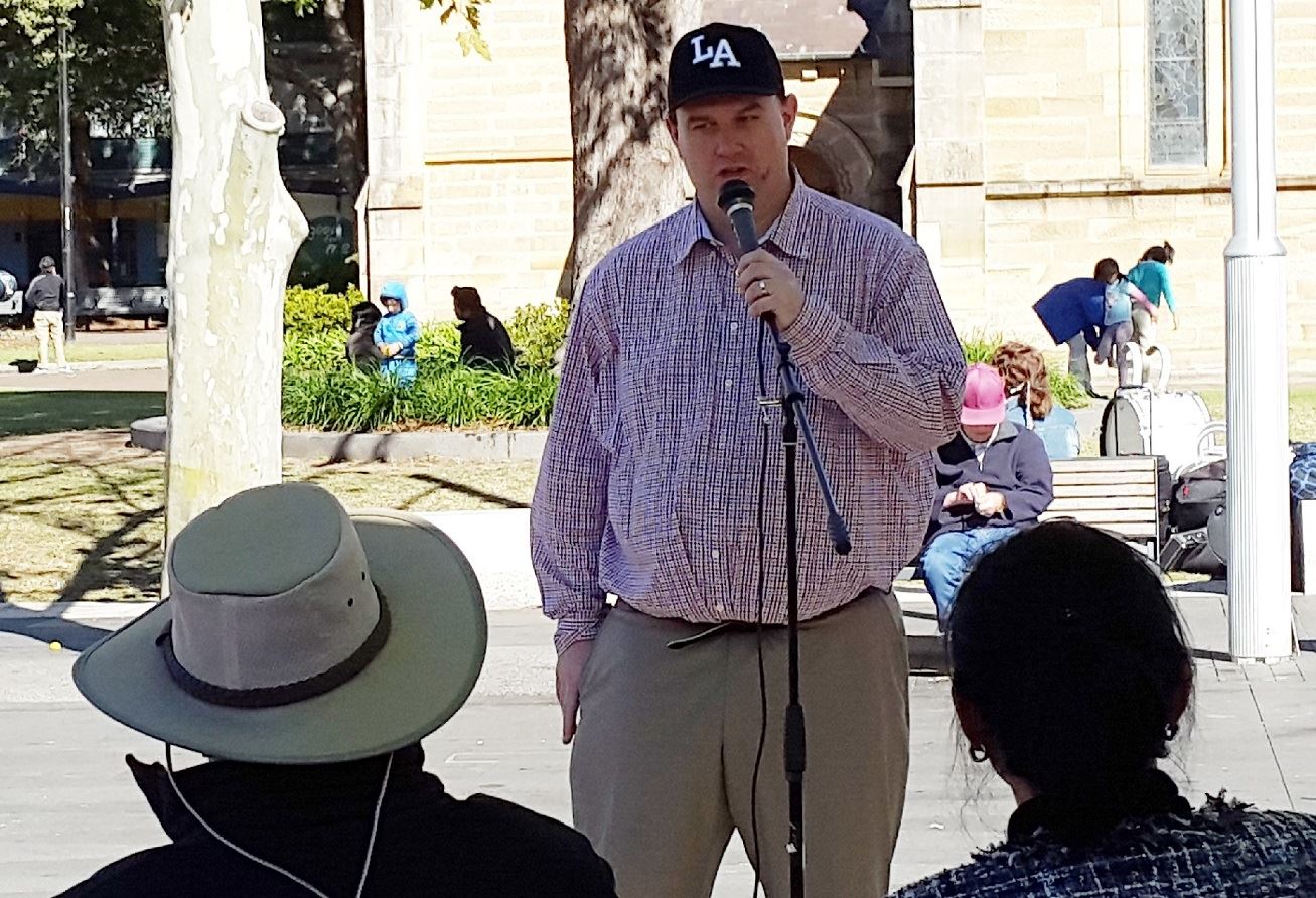 图2:前帕拉玛塔市(Parramatta City)议员、律师詹姆斯·肖(James Shaw)在集会上发言