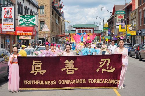 游行队伍沿芝加哥中国城主干道永活街一路向北,经过舍麦街和亚珠街再原路返回。沿路经过的地方,不少路人和缓行的汽车司机拿起手机拍照,有的向法轮功学员真诚地微笑致意,有的伸出大拇指表示赞许。