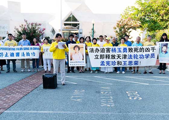 八月四日,华盛顿特区的部份法轮功学员在中共大使馆门前举行集会,要求立即释放杨玉永的妻子孟宪珍,以及同被非法关押在天津的法轮功学员王思荣。