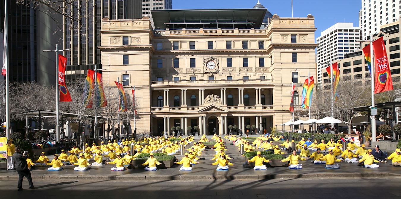 九月八日上午,法轮功学员在位于悉尼环形码头的海关大楼广场进行了大炼功。当时正值交通高峰期,拥挤的人流走出环形码头时,都被眼前的一幕吸引:整齐的黄色衣服和帽子,整齐的队形,舒缓优美的音乐和整齐划一的炼功动作。人们不由的停下脚步,拿出手机拍下这动人的场景。