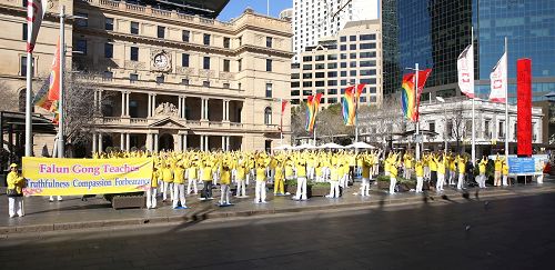 九月八日上午,法轮功学员在位于悉尼环形码头的海关大楼广场进行了大炼功。当时正值交通高峰期,拥挤的人流走出环形码头时,都被眼前的一幕吸引:整齐的黄色衣服和帽子,整齐的队形,舒缓优美的音乐和整齐划一的炼功动作。人们不由的停下脚步,拿出手机拍下这动人的场景。
