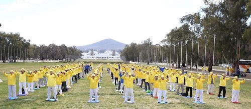 '图1~2:澳洲法轮功学员连续在堪培拉国会大厦前的草地,举行集会'