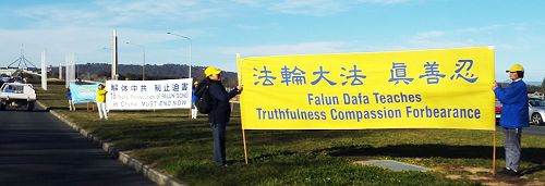 '图3~4:在两天活动期间的上、下班时段,法轮功学员在前往堪培拉国会大厦的路段上炼功展示法轮功的美好'
