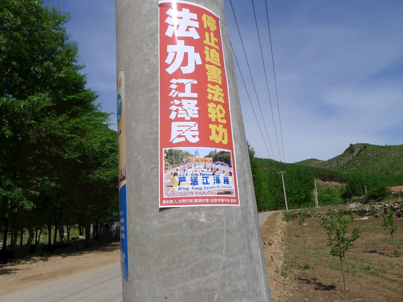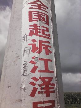 青岛某地一条街道旁的一个电线杆子上贴着一个“全国起诉江泽民”的不干胶条幅,旁边有人写了三个大字“我同意”,表达了百姓的心声。