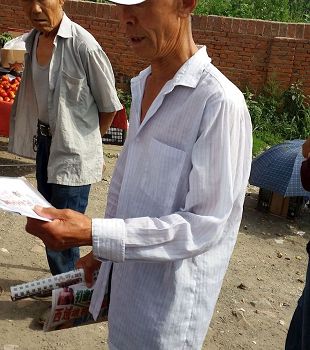 长春某镇大集市法轮功学员,面对面、发真相资料,世人接到真相资料后,喜笑颜开的场面。