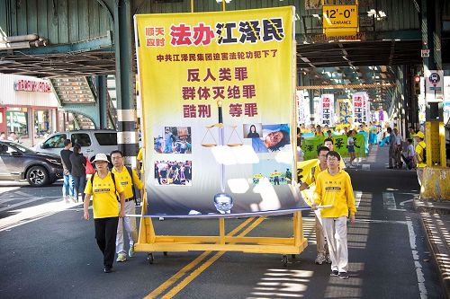 一个多小时的游行过程中,沿途两边都由义工发送真相报纸,劝有缘人三退。很多人接受真相资料,一些人明白真相后做了三退。