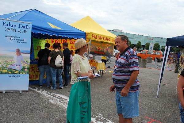 在展位旁的空地上,法轮功学员们随着祥和的炼功音乐,全天展示功法,吸引游客驻足观看。有一名女士表示,她想学炼法轮功,还带走了一些法轮功介绍资料,打算放在自己的店里,让顾客也能接触到这份机缘。一位年过七旬的妇人表示,她以前就听说过法轮功,自己也炼过,知道这个功法非常有益于身心健康,她询问在伯尔尼哪里有炼功点,希望能够去参加集体炼功。