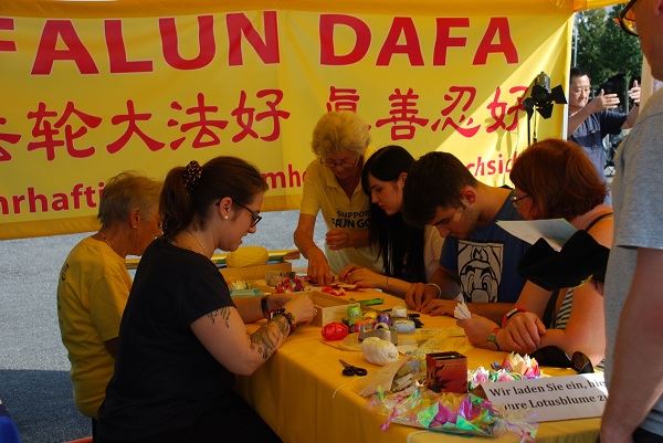 有许多游客在法轮功展位前驻足,他们或是静静观看炼功,或是欣喜地带走一朵精美的小莲花挂饰,或是聆听学员们讲解大法在世界弘传的盛况,以及在中国发源地遭到惨无人道镇压的真相。他们表示,对中共野蛮的迫害感到非常震惊。