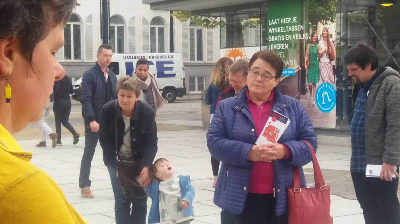 一位戴着眼镜的女士名叫玛丽·德莱士·韦贝克(Marie-ThérèseVerbeke),她说:“非常荣幸看着这些人炼功,真的!”她指着一个穿粉色衣服的小女孩说:“看着她(炼功),真的感觉很好!”旁边的学员借机告诉她,这个小女孩的父母因修炼法轮功而被迫害,他们逃离了中国,几经辗转,才来到了比利时。那时,她还在中国,由家里的老人照顾着。玛丽非常同情他们一家人的遭遇,她也被他们对法轮功的坚定信仰所感动,她站在那里十多分钟,静静地看着女孩炼功。最后玛丽说:“虽然我的家离根特炼功的地点比较远,但是我肯定要再来这里学炼法轮功!在我的生活中,我从来没有如此特殊的感觉……”她的眼睛放着光,她被法轮功及学员们这种积极的方式深深地打动了。