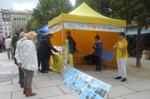 【明慧网二零一七年九月二十日】有“威尼斯水城”、“艺术才华的磁石”之称的比利时根特市(Ghent),被联合国教科文组织列为世界五个音乐之都的其中之一,每年吸引了大量的国内、国外爱好和欣赏艺术的人前来这里,享受这美丽、友好的音乐和文化盛会。“Odegand”是根特著名的音乐节,每年九月份的如期举行,同时间举行的文化市场也吸引了众多游客,在市中心的库尔德(Kouter)广场。广场周围大部份是十九世纪的建筑,有着浓郁的传统气息。和其它一百多个协会一起,法轮功修炼者也借机向这里的民众传播功法,并且向人们介绍有关法轮功的信息。
