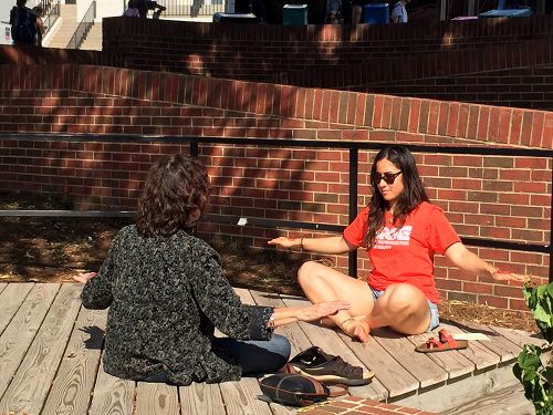 法轮功学员们在乔治亚大学校园中心地带的Tate学生活动中心前的广场,搭设了帐篷,竖立了展板,学员们有的在那里炼功,有的分发真相资料,有的徵集签名。法轮功亮丽优美的功法展示和触目惊心的展板,吸引了一批批的大学生和教师们。人们纷纷驻足,了解真相,签名支持,很多人当场盘腿打坐、开始学炼法轮功。