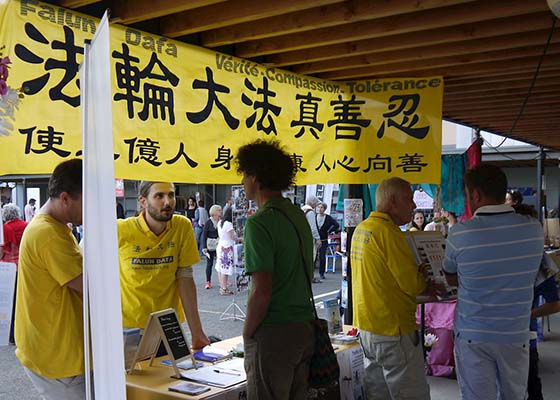 法轮功学员参加了法国安纳西的别样生活展示会,介绍法轮功。当很多人知道在中国法轮功学员遭受的迫害时,都在反迫害征签表上签字,想要帮助法轮功学员。