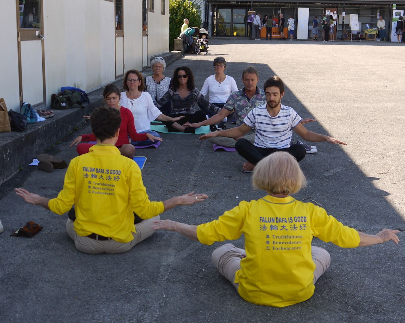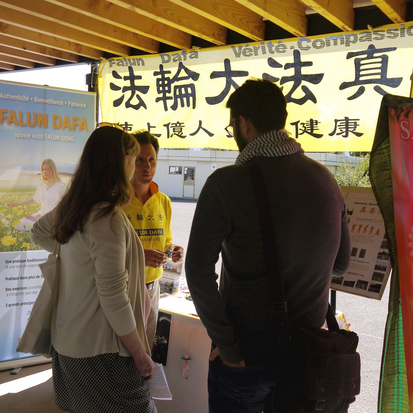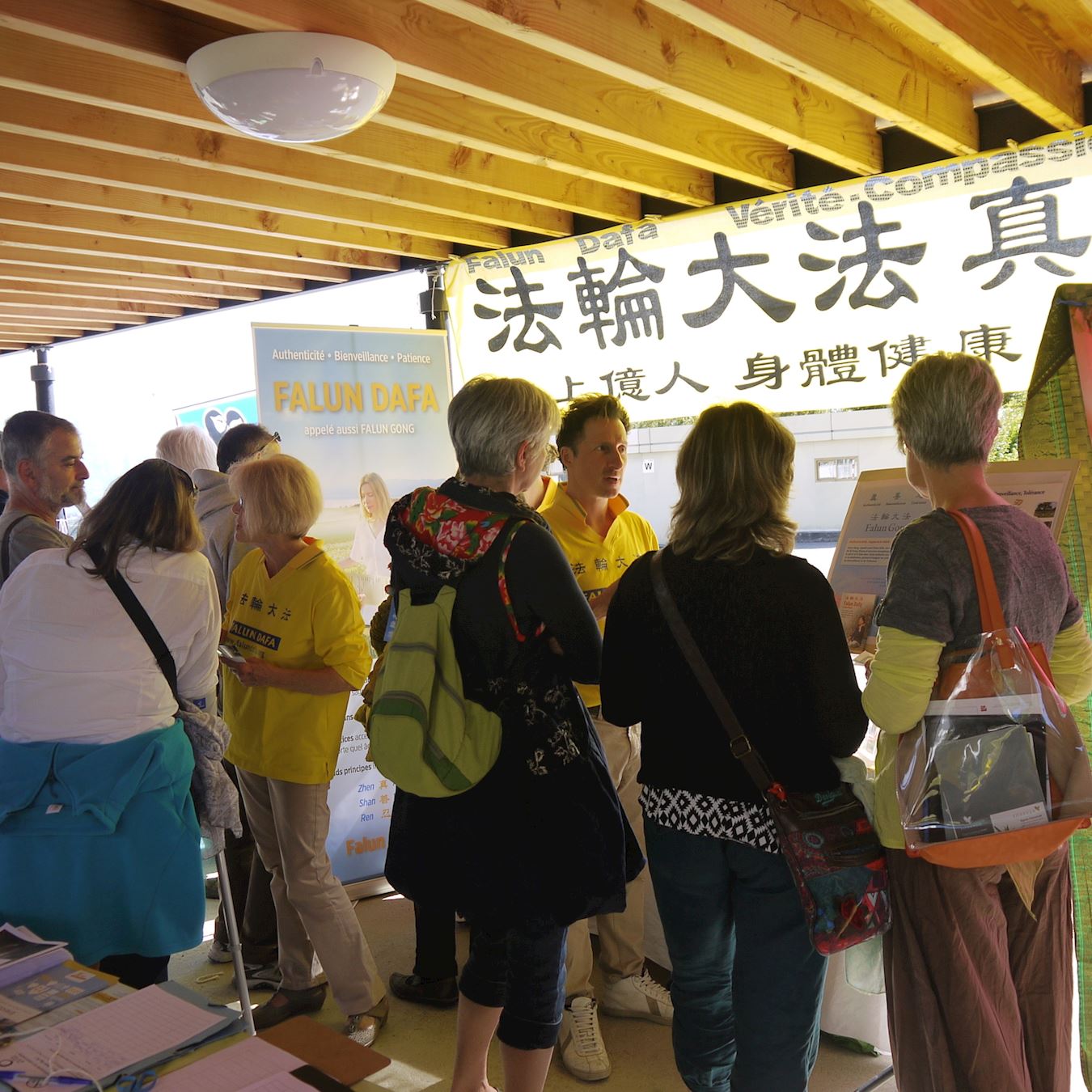 【明慧网二零一七年九月二十六日】(明慧记者周文英法国报道)二零一七年九月二十三日和二十四日,法国法轮功学员参加了法国边陲城市安纳西(Annecy)的别样生活展示会(Forum Alternative),展会期间,进行了介绍法轮功、教炼法轮功和讲真相的活动。安纳西是法国罗讷-阿尔卑斯大区上萨瓦省的首府,位于法国东南方,地处阿尔卑斯山脉西北麓,与瑞士接壤。那里群山环抱,湖水湛蓝,风景秀丽。