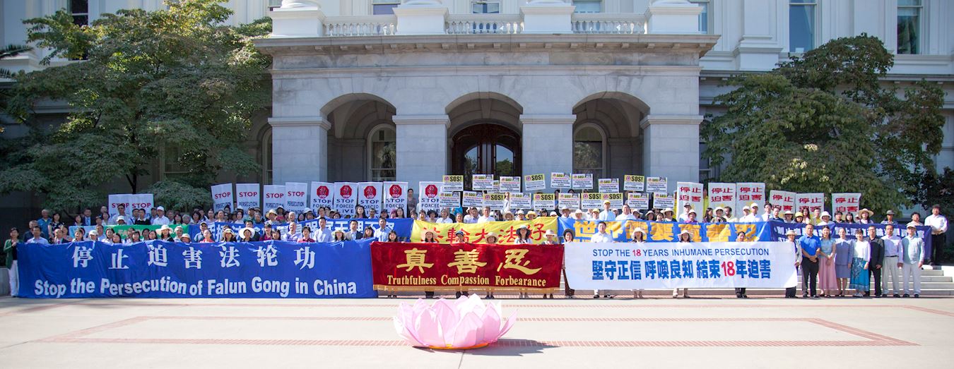 当天,二百多位法轮功学员打着“坚守正信 呼唤良知 结束18年迫害”、“停止迫害法轮功”、“活摘法轮功学员器官天理不容”等横幅,呼吁加州各界帮助制止中共对法轮功十八年来的迫害。