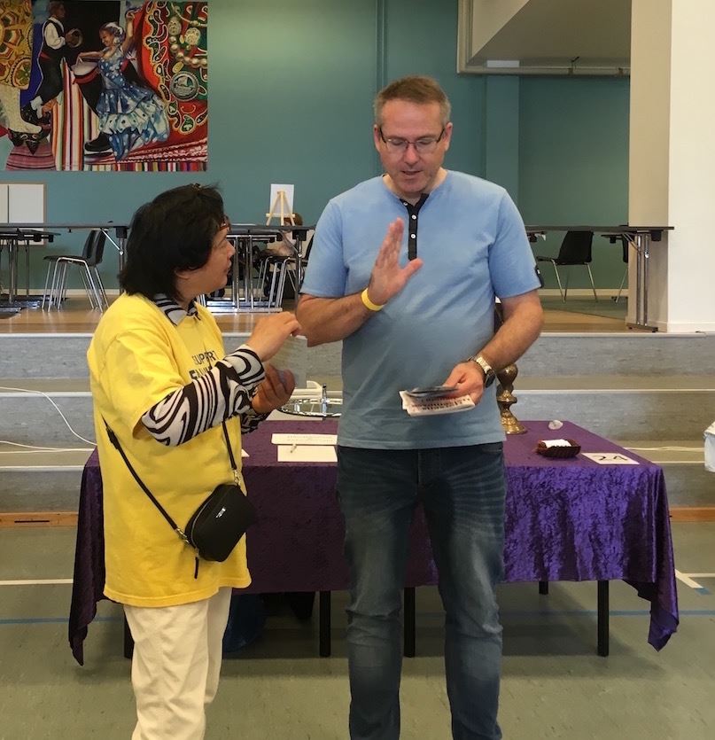 参展商Erik提了一些问题:你们为什么来这里?要告诉人们什么?你们教学功法不收费,介绍会也不收费,你们的钱从哪里来?当他知道学员们都有自己的工作,是在用自己的业余时间和钱,这是因为法轮功太好了,想把这个功法介绍给所有的民众。他听到后感叹道:“你们真的了不起!”