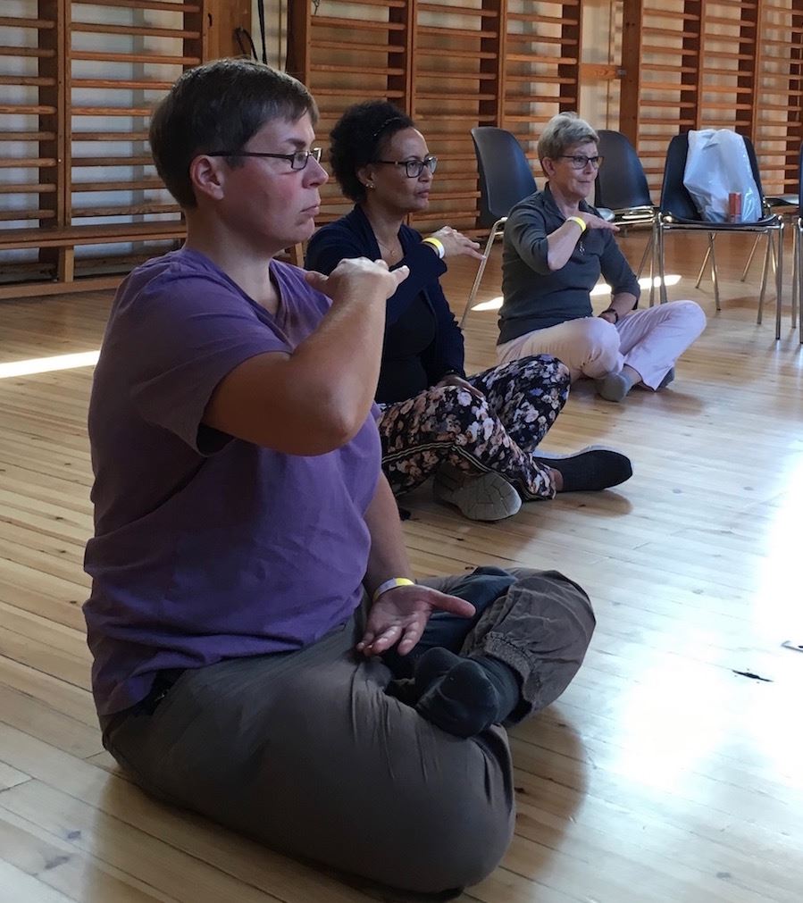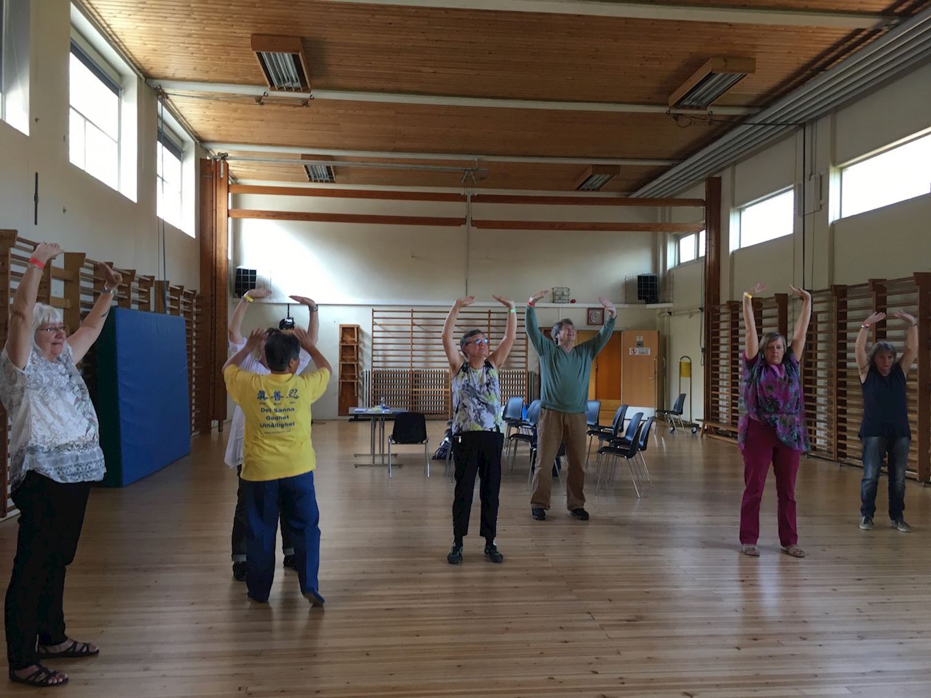 Inge和她的朋友是学校的退休老师,她们错过了第一天的学功时间,她们第二天又来到博览会告诉学员说:“我们今天又来了,是专门来学功的。”在学功场上她们学得很认真,五套功法炼下来感觉很好很舒服,Inge表示:“我喜欢这个功法。”当她知道在网上有录像可以跟着炼,在离小城不远的有炼功点可以参加集体炼功时很高兴地说:“好主意,我们也可以开车结伴去炼功。”