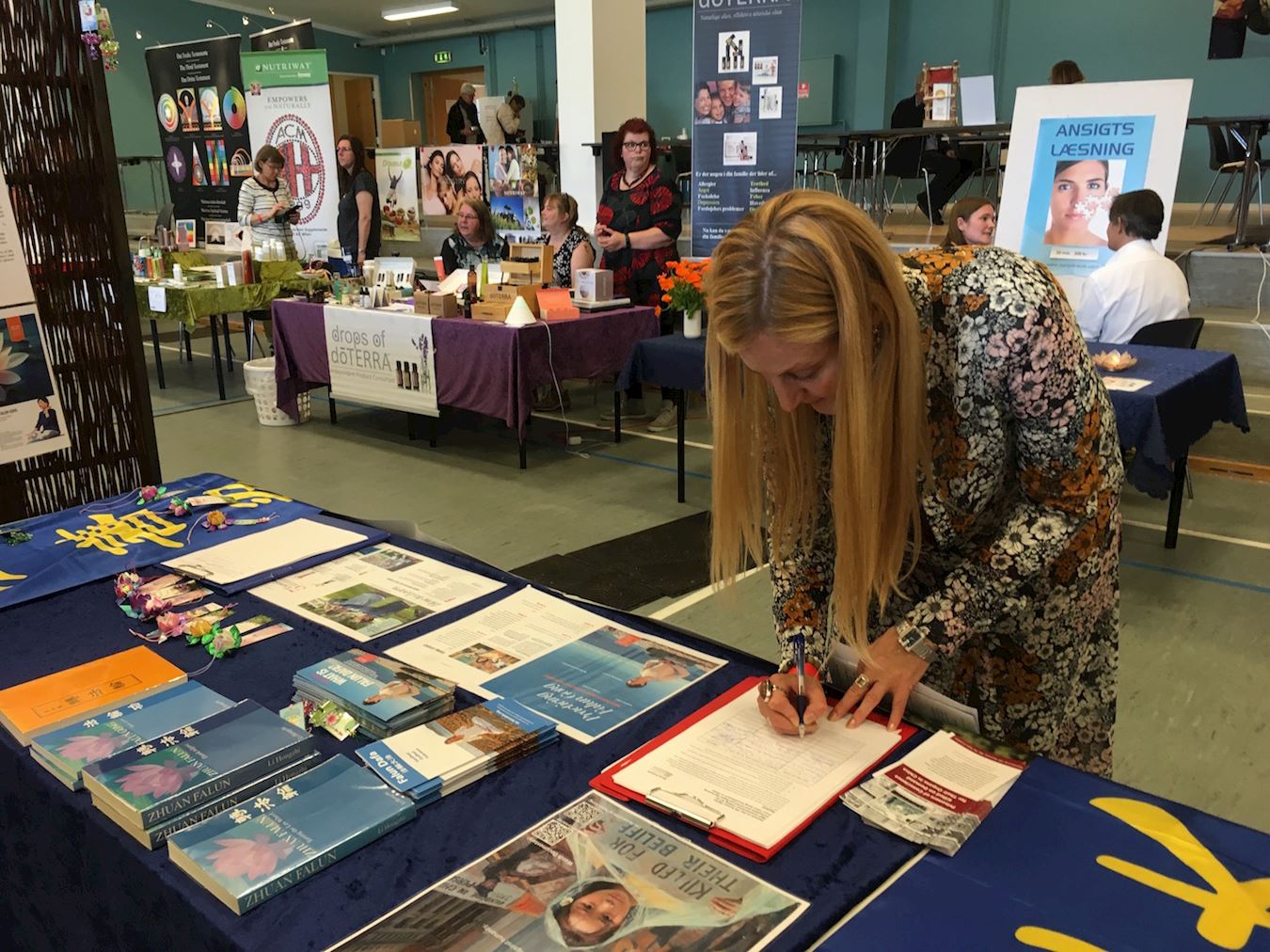 Annelis 和Kim在听到学员介绍有关中共政权国家性地系统地活摘法轮功学员器官时立即签名,帮助尽早结束这场迫害。Annelis 还告诉展位旁的其他人:“你们都来签名,反对中共强摘器官”。