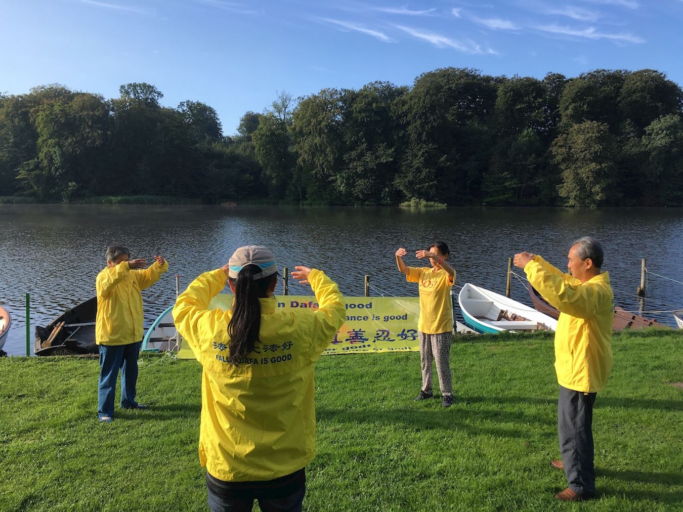 在博览会期间还有个小插曲,在第二天清晨法轮功学员来到了博览会旁边的小湖边,挂起了“法轮大法好 真善忍好”中英文横幅,迎着朝阳炼功,周围的居民也得到了法轮大法的信息。在往回走的途中,一辆汽车突然停在学员的身边摇下车窗,问学员道:“你们是去博览会的吗?可以坐我的车一起去。”原来她想帮助学员。学员很感慨:“丹麦人真的很善良,有缘人都在寻找大法。”