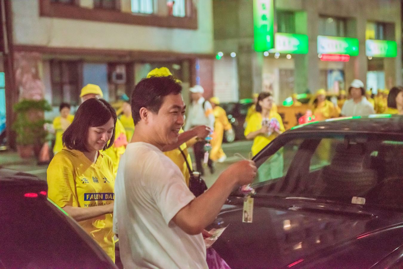 图4:人们开心的接过法轮功学员手制的精美莲花