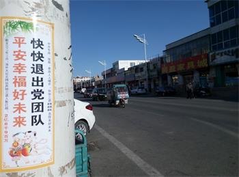 我在此停留半天时间,作为法轮大法弟子,走到哪里,都不忘记救人的使命,把“法轮大法好”的福音,过年好的祝福,三退保平安的信息等,以照片和粘贴的形式带给林东的父老乡亲,祝福善良的林东人尽快了解真相,退出“党、团、队”的组织,为自己的生命选择永远美好的未来。