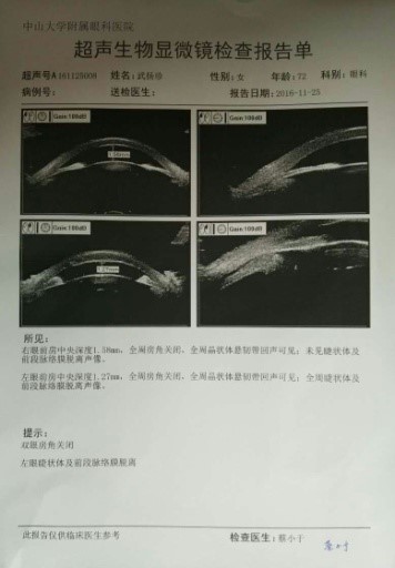 从洗脑班回家当天晚上,二零一六年十一月二十一日晚二十三点,家人带武扬珍到中山大学中山眼科中心就诊;其后,十一月二十二日、二十三日、二十五日,家人又多次带武扬珍去中山眼科中心诊治,医院建议:马上住院治疗。