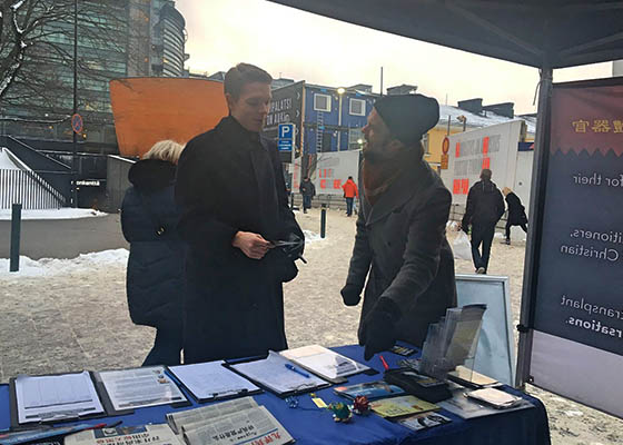二零一八年一月二十日,芬兰学员象往常一样来到首都赫尔辛基市中心,设立真相点,对当地民众讲真相,并且征集签名制止中共对法轮功学员的迫害。
