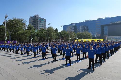 【明慧网二零一八年一月三日】(明慧记者夏昀台湾台中采访报导)二零一八年一月一日,新年伊始,台中市政府的大广场上聚集了来自大台中地区的部份法轮功学员,他们身着亮眼的宝蓝外套,随着悠扬的音乐,整齐划一的演炼五套功法。广场前的台湾大道上车子川流不息,过往的人们纷纷被这景象吸引。
