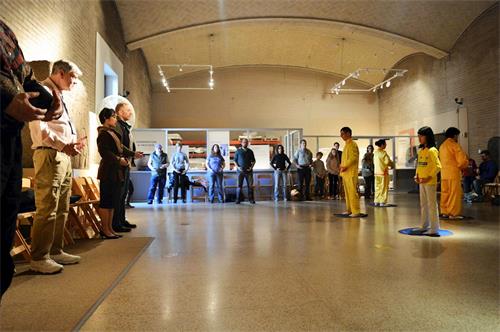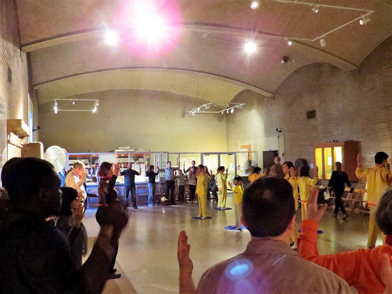 中午12点,法轮功学员在一楼的Sphinx展览厅进行了功法演示。学员菲尔(Phil)向观众介绍说,法轮功功法简单易学,强身健体有奇效。法轮功学员遵循“真善忍”的原则,身心和道德都得到显著提高。在悠扬的炼功音乐中,现场的二、三十位观众跟着学炼起了法轮功。