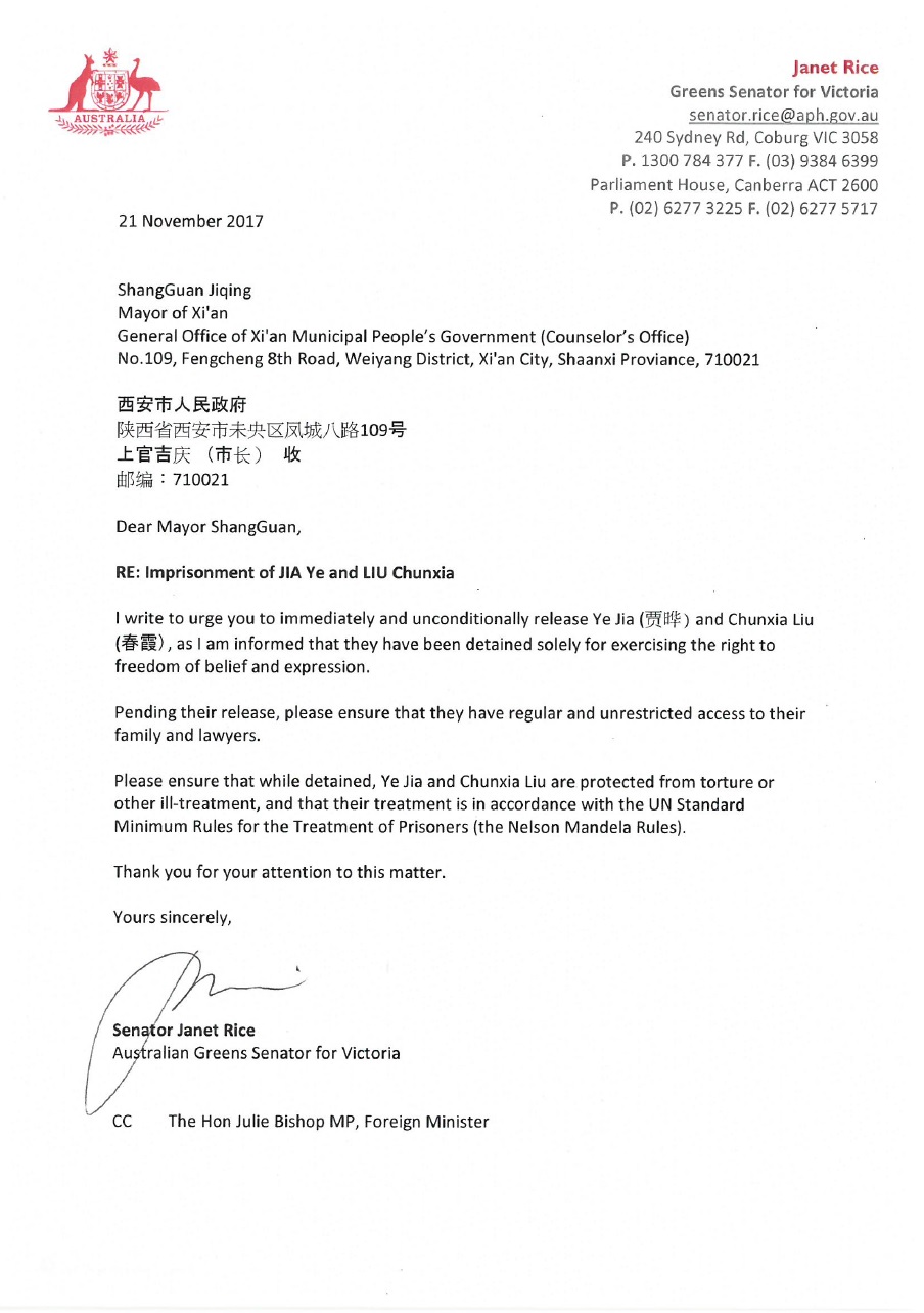 澳洲国会参议员莱斯(Janet Rice)致信西安市市长上官吉庆,要求他立即无条件释放两名法轮功修炼者。