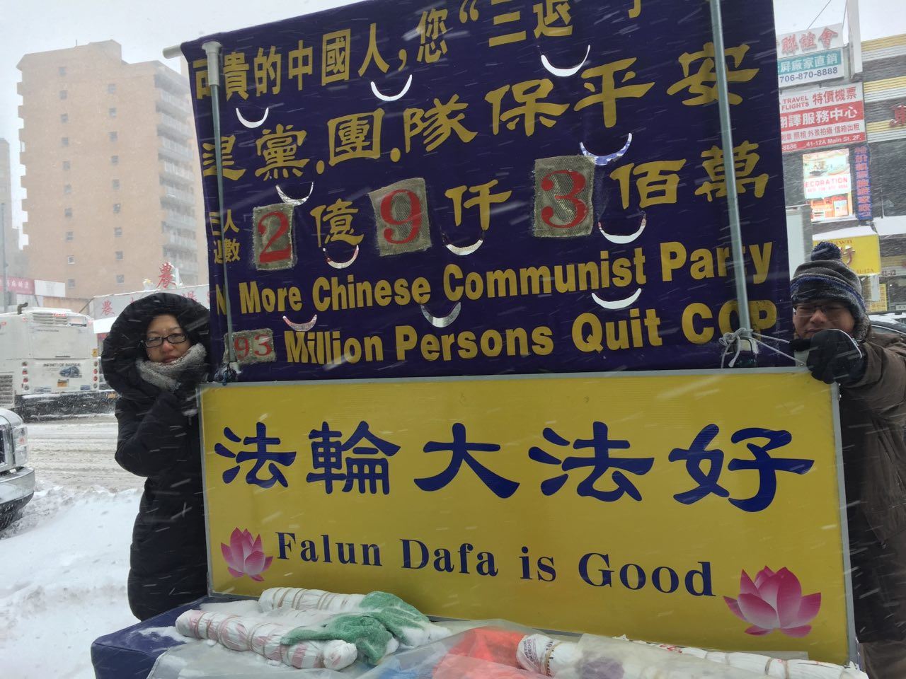平时熙熙攘攘的华人社区法拉盛,笼罩在白色的苍茫中,但当天依然有不少要上班的华人顶风冒雪出门,各大中国超市都正常开。五十岁的法轮功学员孙同,早上九点多就象平时一样,在图书馆前冒着风雪架起真相点的桌子和“法轮大法好”“三退人数2亿9千3百万”的条幅。当天,总部位于法拉盛的“全球退党服务中心”,近二十名法轮功学员从早上十点到下午四点轮流坚守着图书馆前的真相点,有的学员负责固定条幅,不让风吹倒;有的学员负责发资料、放真相广播。这个真相点在图书馆前已经摆设了超过十几年,法拉盛的华人无人不知。