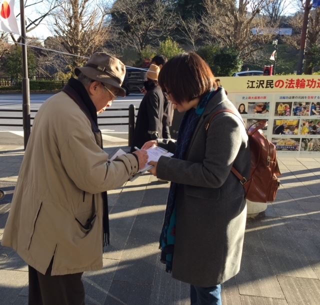 一位中年女士边签名字边说:“这样的事情必须停止。”一对中年夫妇走到签名点前说:“之前了解法轮功在中国被迫害,当时就签名了;你们加油!”还有在日本工作的西方人,新年期间也随着日本的风俗习惯去祈福。一位西方人表示自己知道法轮功被迫害的事,他说:“中共活摘人体器官是恶魔的行为,在中国是没有信仰自由,言论自由,思想自由的,我完全相信发生在中国的这些恶魔的行为。”他还表示支持法轮功学员控告江泽民,“每个人应该做点什么,让更多的人知道中共的邪恶,给中共施加更多的压力。”在征签的过程中,还碰到来自非洲的几个民众,其中一人说:“支持你们的征签活动,都应该支持这样的正义行为。”