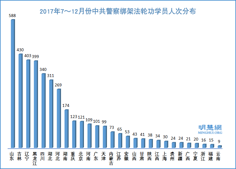 下半年绑架迫害最严重地区:山东 588人、吉林430人、辽宁403人、黑龙江399人、四川340人、湖北311人、河北269人。