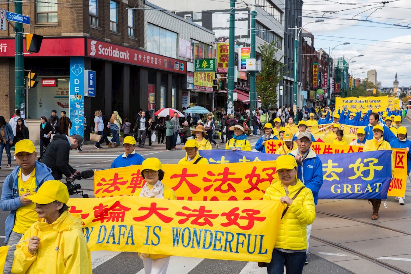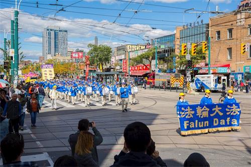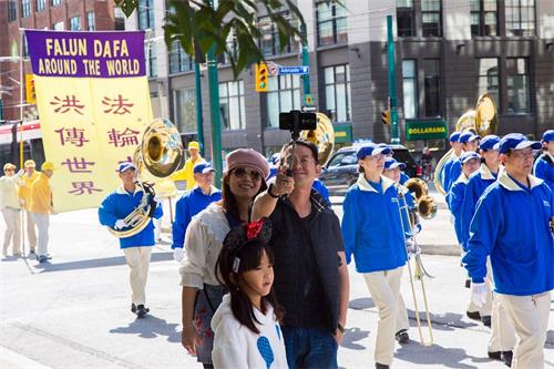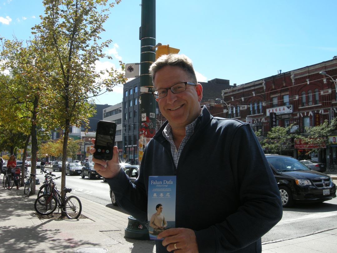 在游行途经唐人街时,法轮功学员看到有一个大陆来的旅行团在路旁观看游行,就走了过去,其中一位约三十来岁的小伙子主动向这位学员要了一份真相资料,并对法轮功学员说:“我想了解一下为什么这里有这么多人修炼法轮功,而在中国却没看到过法轮功学员?”