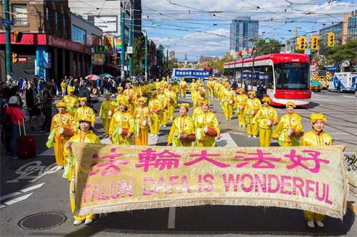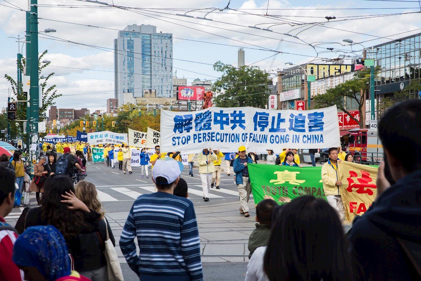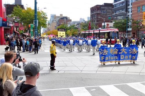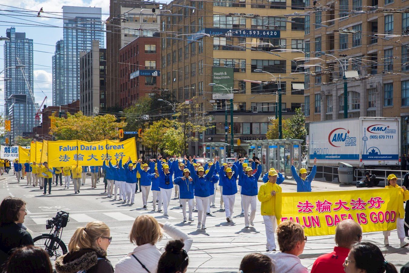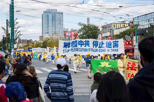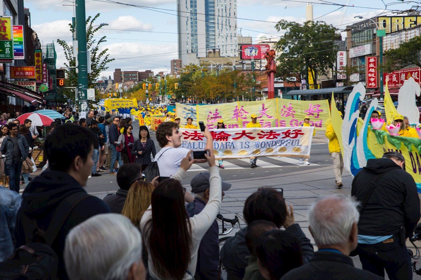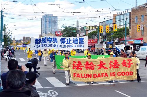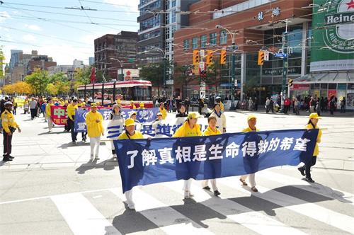 多伦多的金秋特别温暖,当天阳光明媚,由法轮功学员组成的天国乐团打头阵开道,带领浩浩荡荡的游行队伍两次经过市中心唐人街,很多路人拍照和录像,大法美好的展现让不少西人表示想学法轮功,不少明白真相后的华人现场做三退。有的感谢法轮功学员坚持不懈的讲真相让他们做了美好的选择;有的握着法轮功学员的手道谢;有的表示已经上网给全家人都退了;有的给法轮功学员合十鞠躬,感谢他们的付出。
