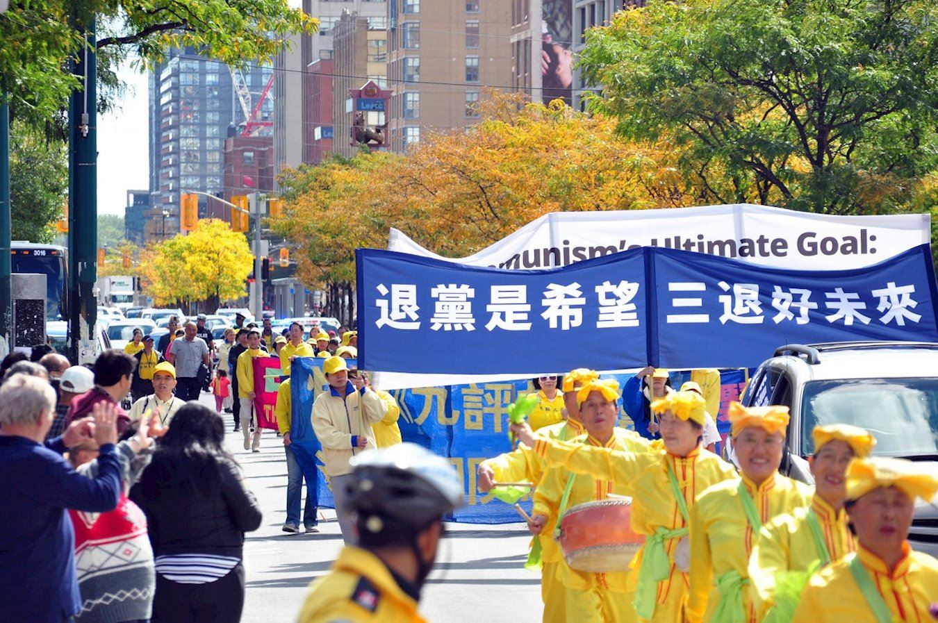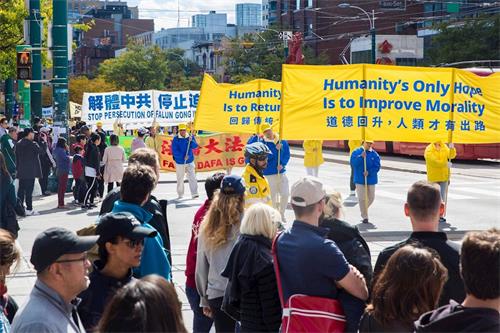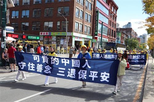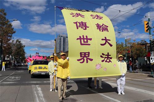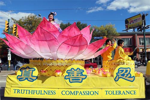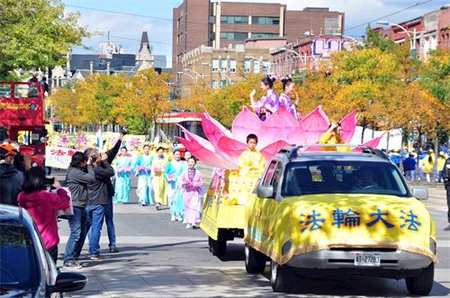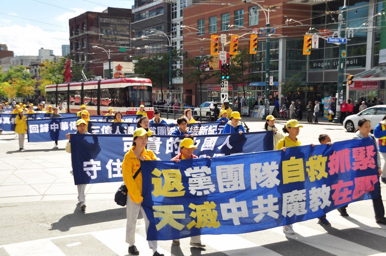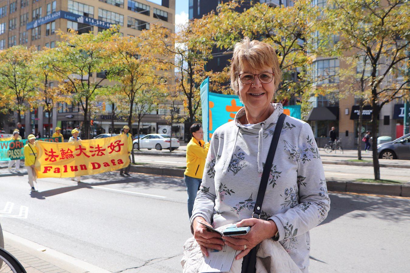 多伦多的金秋特别温暖,当天阳光明媚,由法轮功学员组成的天国乐团打头阵开道,带领浩浩荡荡的游行队伍两次经过市中心唐人街,很多路人拍照和录像,大法美好的展现让不少西人表示想学法轮功,不少明白真相后的华人现场做三退。有的感谢法轮功学员坚持不懈的讲真相让他们做了美好的选择;有的握着法轮功学员的手道谢;有的表示已经上网给全家人都退了;有的给法轮功学员合十鞠躬,感谢他们的付出。