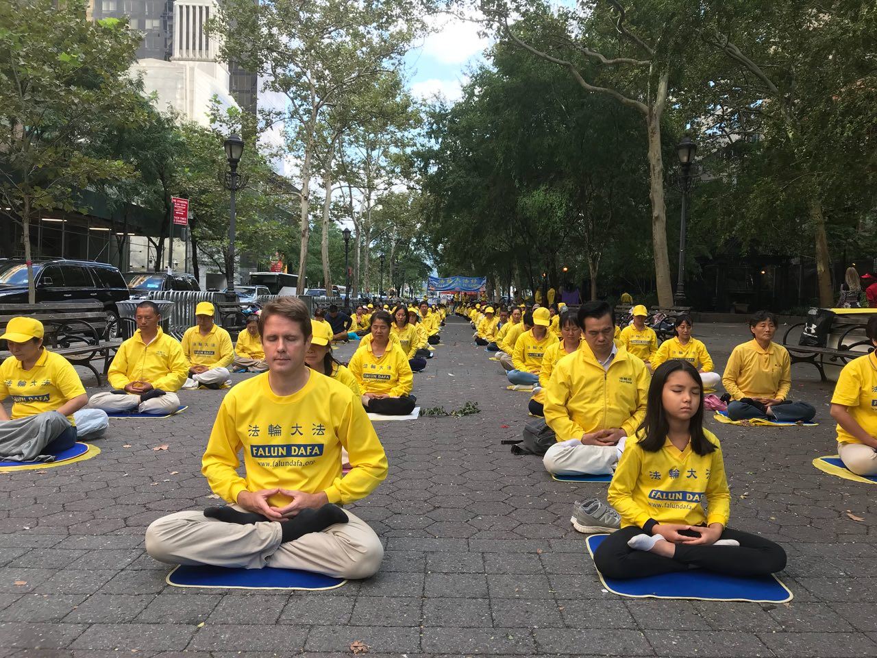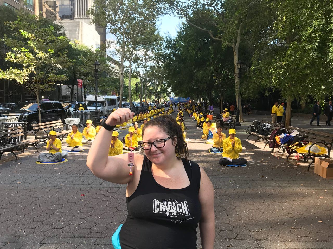 居住在联合国附近的伊丽莎白(Elizabeth)经过,看到法轮功的和平请愿活动,她静静地看着法轮功学员炼功看了很久,说:“你们这么平和,了不起。宁静中显非凡。”