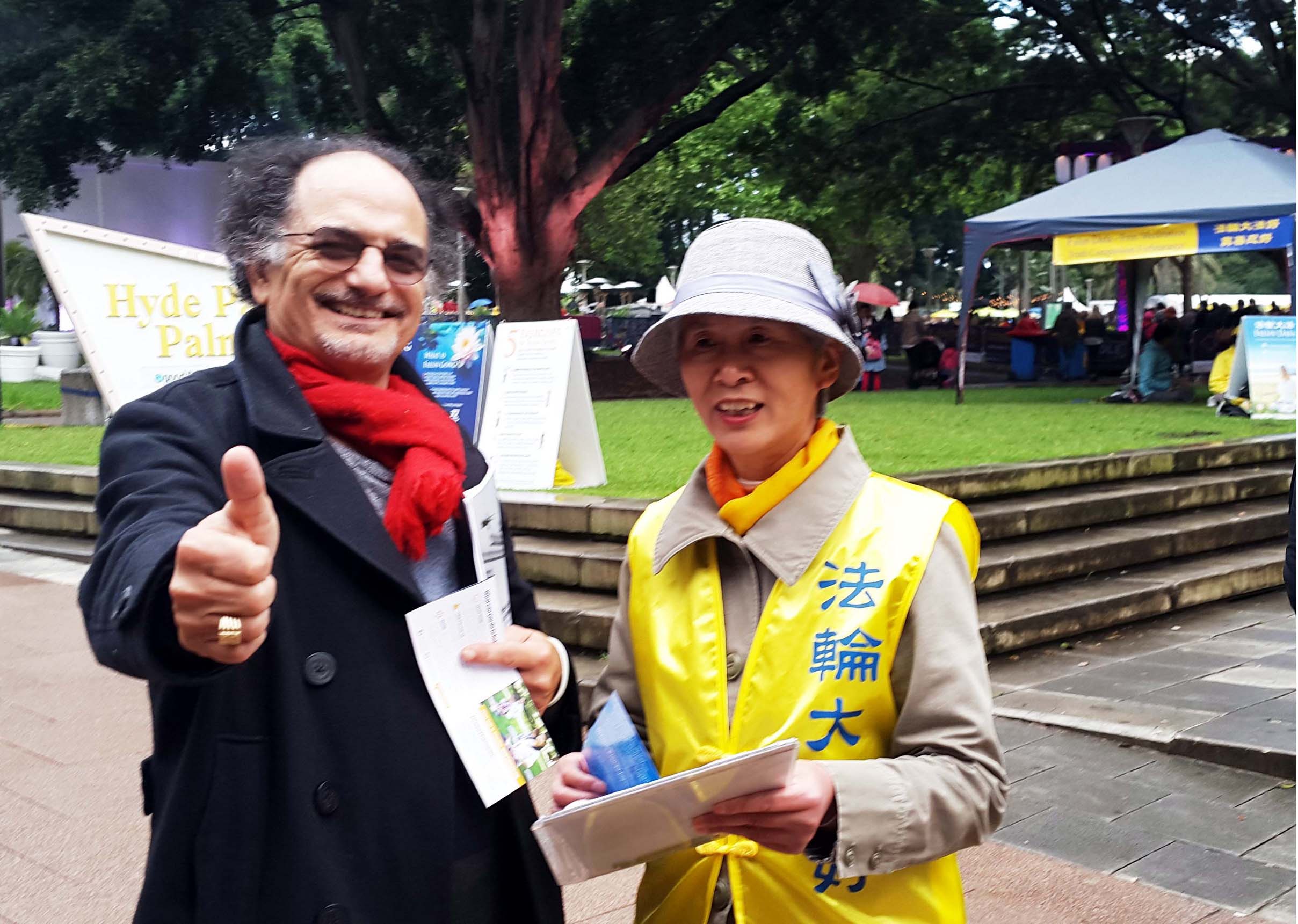 亚瑟·克罗斯(Arthur Cross)从远处看到法轮功学员的讲真相展位,高兴地径直走到法轮功学员面前,竖起大拇指赞美法轮功,他说:我全力支持法轮功!我知道法轮功非常、非常祥和、美好,并且带有很强大的能量。我非常敬佩你们坚持不懈告诉人们这些修炼的好处和讲述被迫害真相。