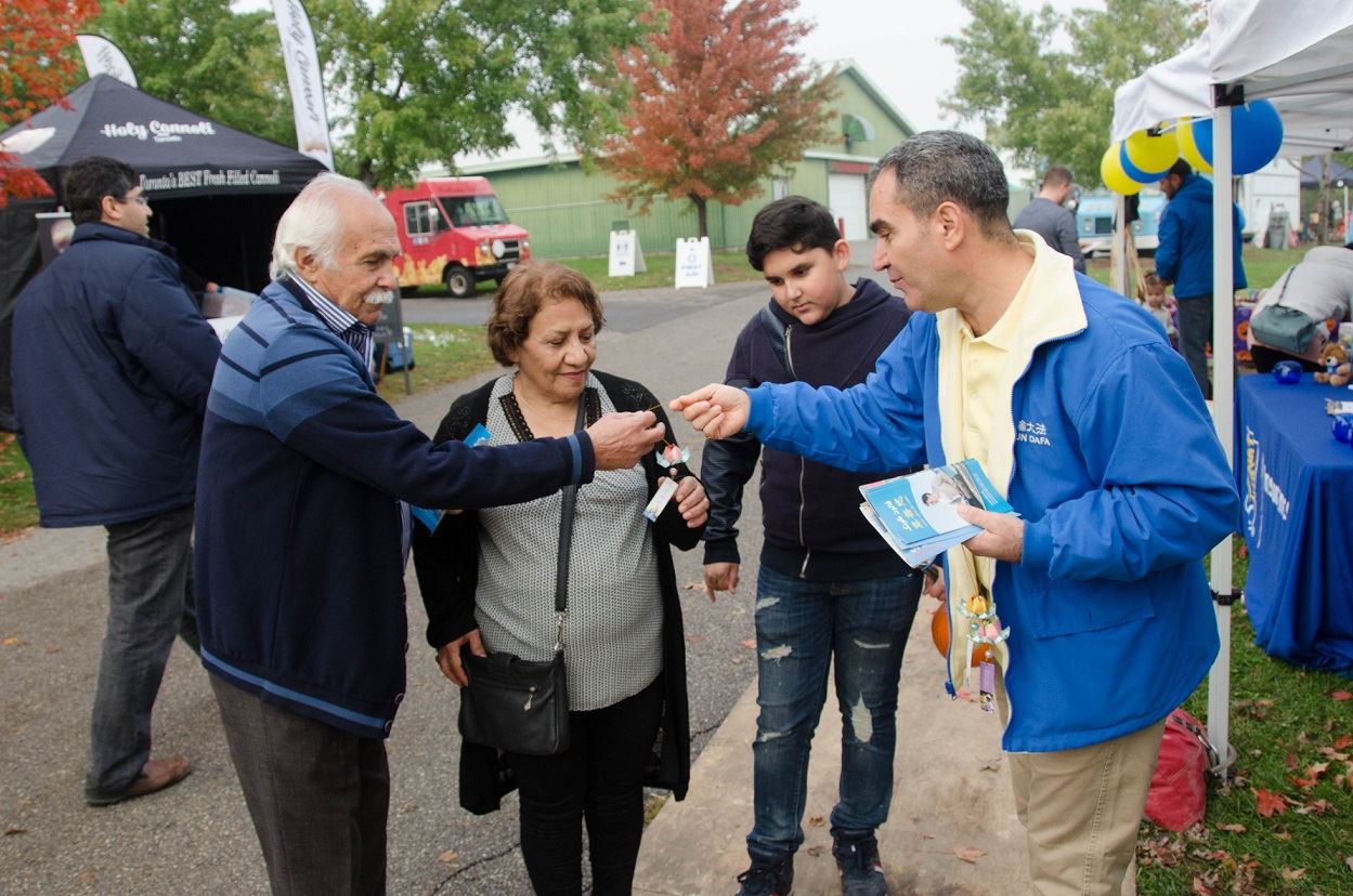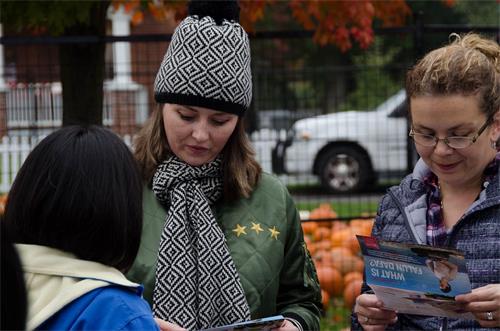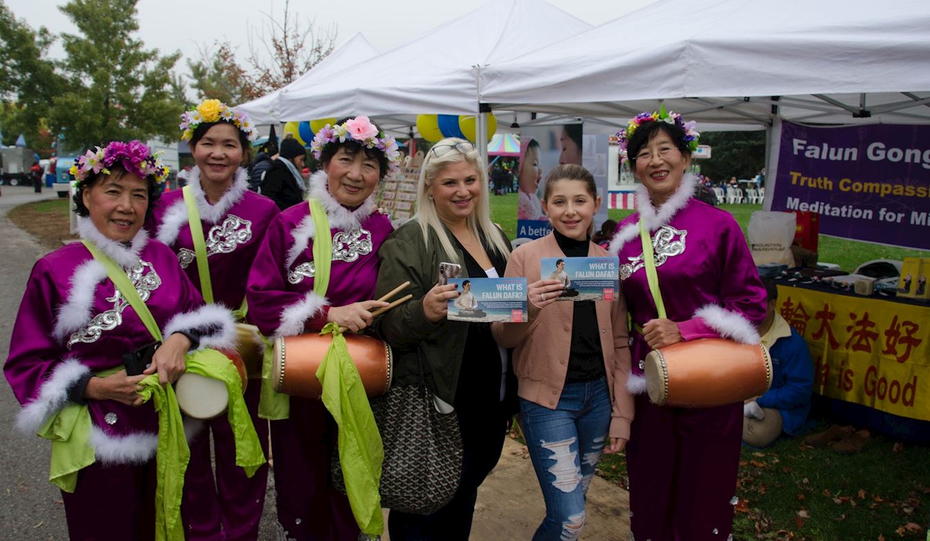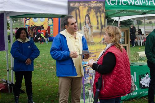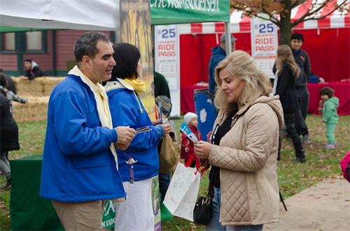 南瓜节庆典活动是加拿大秋季感恩节假日中的一项传统,庆典中不仅有各种娱乐活动,还有各种文化展示,每年都有很多人参加。前来参加南瓜节的有很多当地其他族裔的民众,许多人接过了法轮功的资料,有的人还和法轮功学员合影留念。