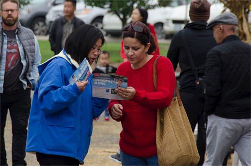 一位女士听法轮功学员介绍法轮功在世界一百多个国家和地区弘传、上亿人身心受益,她对法轮功不收费用感到很惊奇。法轮功学员告诉她:“我们都是义务来这里的,因为法轮功不仅给了我健康的身体,也改变了我这个人,我知道怎样去做一个好人。”这位女士告诉学员:“你知道吗,我今天来这里是有原因的,你告诉我的可能就是那个原因。”她表示自己回去要认真了解法轮功。