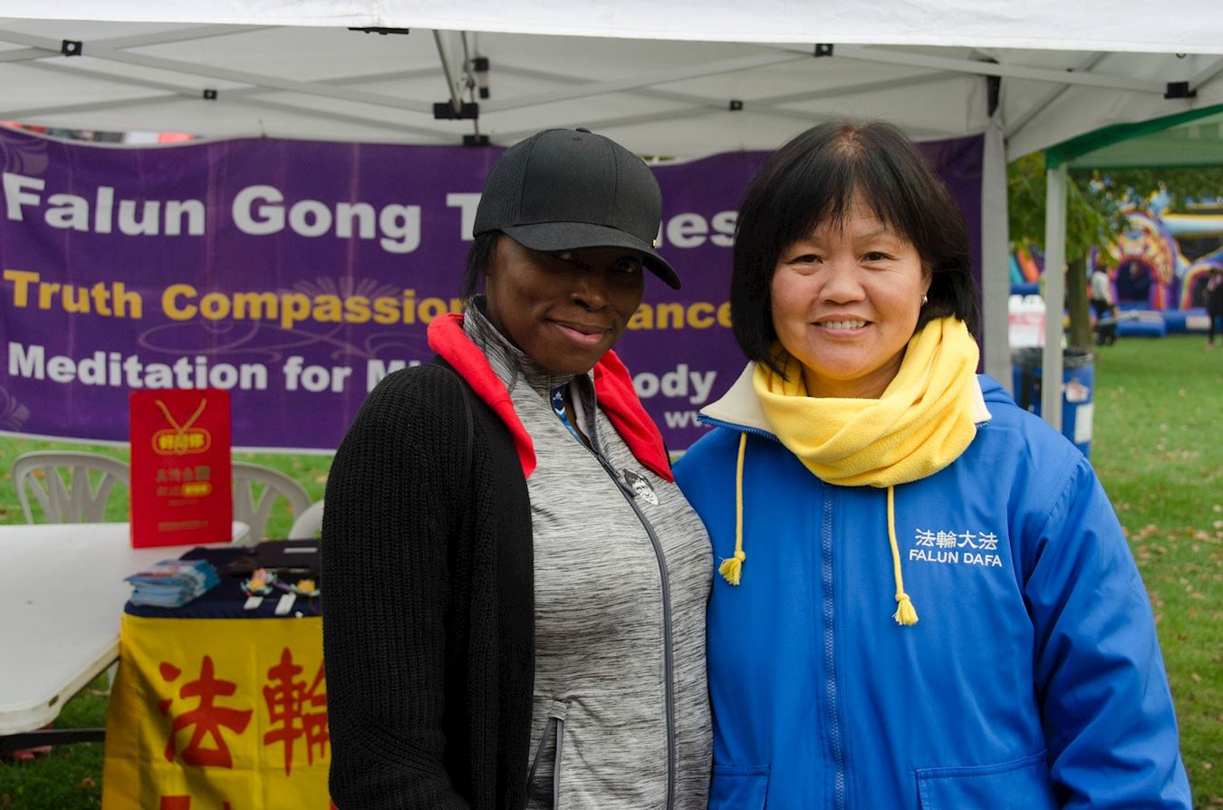 提阿娜(Tiana)女士看到在法轮功展位上炼功的学员停下脚步,学员向她介绍说法轮大法不仅祛病健身方面有奇效,还帮助人们解除焦虑,更帮助人们提升道德,她告诉学员:“我得炼这个,我需要改变我自己。”提阿娜女士在得知法轮功有九天的义务教功班时,高兴地留下自己的联系方式。