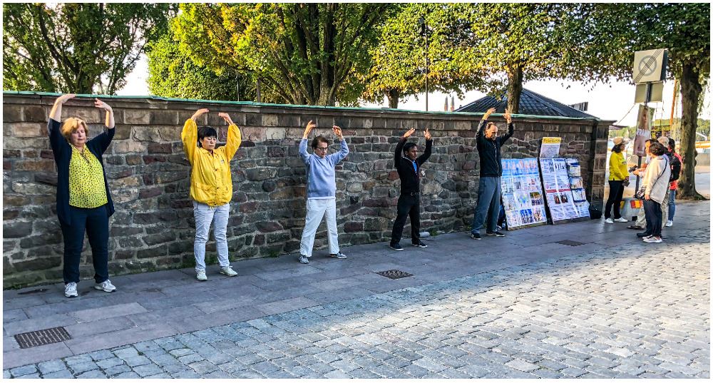 ![]() 图1:法轮功学员在斯德哥尔摩市政厅入口处的真相点演示五套功法。 |