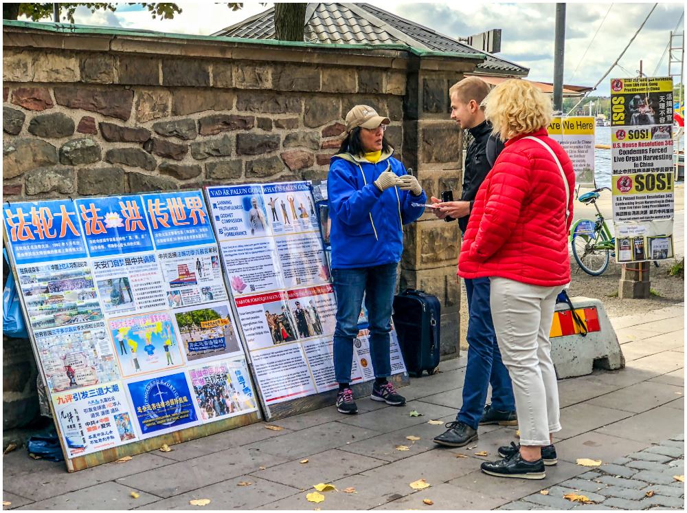 第二天又来了一位瑞典人,主动要了解法轮功,以及中共为什么要迫害法轮功,这位先生很健谈,都下起雨了他也不走。明白了真相后,他对学炼法轮功特别感兴趣。他告诉学员,自己以前听说过中共在迫害法轮功,他觉得中国是一个大国,发展的那么快,有点人权问题也是很正常的。没想到会这么严重、甚至活体摘取法轮功学员器官,太恐怖了!