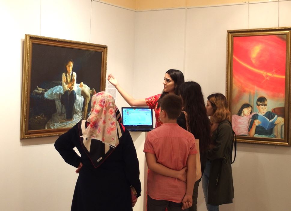 ![]() 图5:Şeyma女士(右2)赞赏法轮功学员用美展的方式让人们了解真相 |